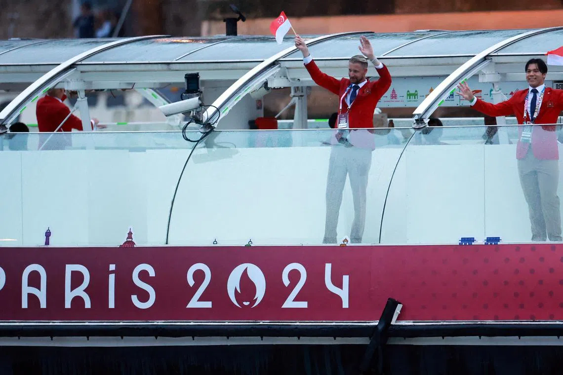 Singapore’s athletes aboard a boat in the floating parade on the River Seine.