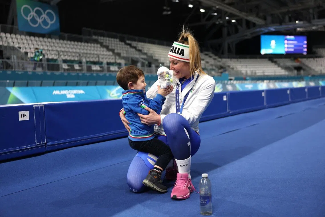 Women’s 3,000m speed skating gold medallist Francesca Lollobrigida of Italy celebrating with her son after the victory ceremony.