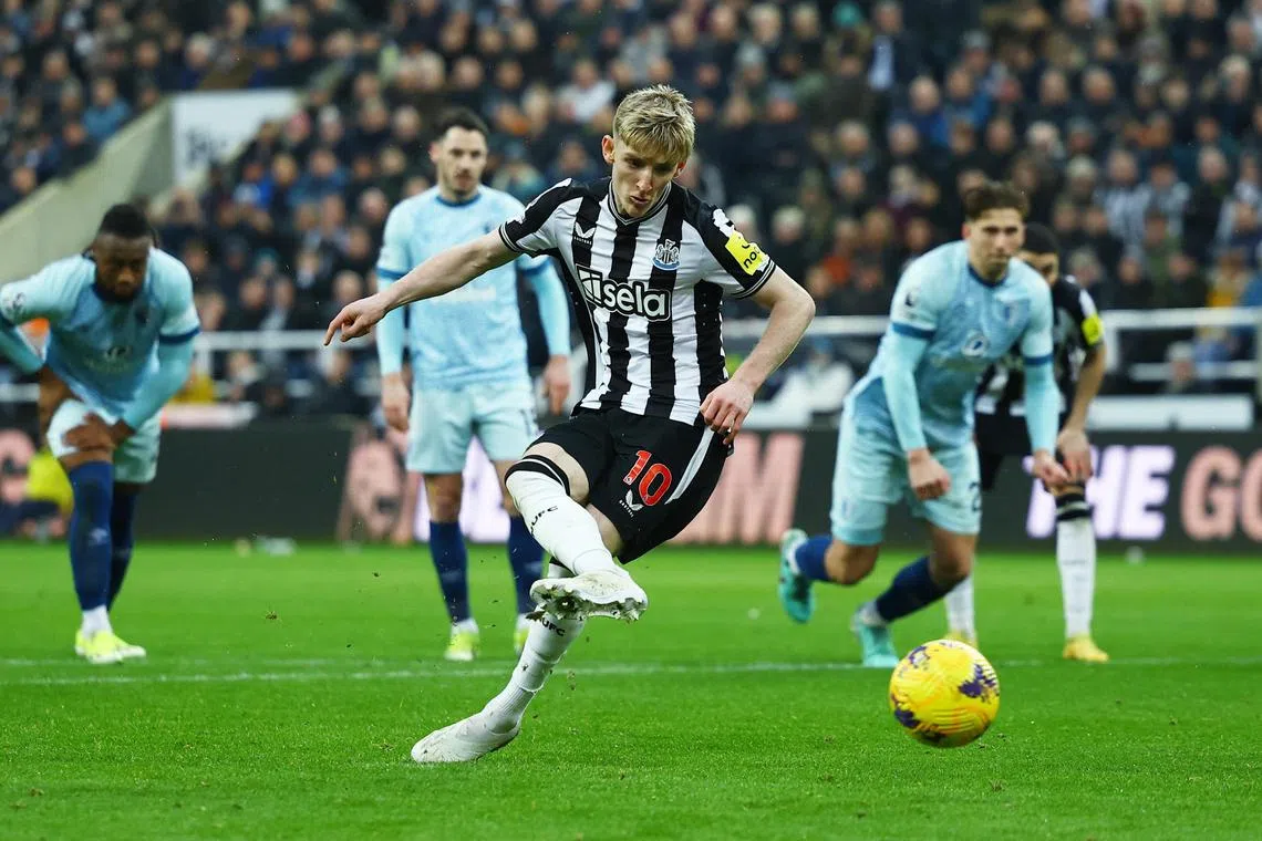 Newcastle United’s Anthony Gordon scores their first goal from the penalty spot.
