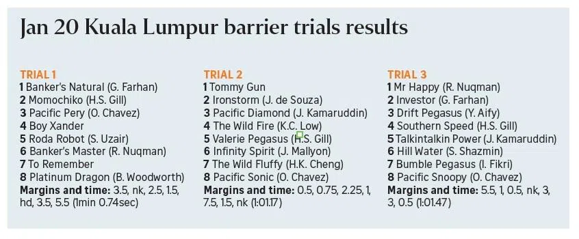 Mirroring the sparkling form shown by his runners early in the 2026 Malaysian season, Singaporean trainer Johnny Lim Boon Thong took two of the three barrier trials at his home base of Kuala Lumpur on Jan 20.