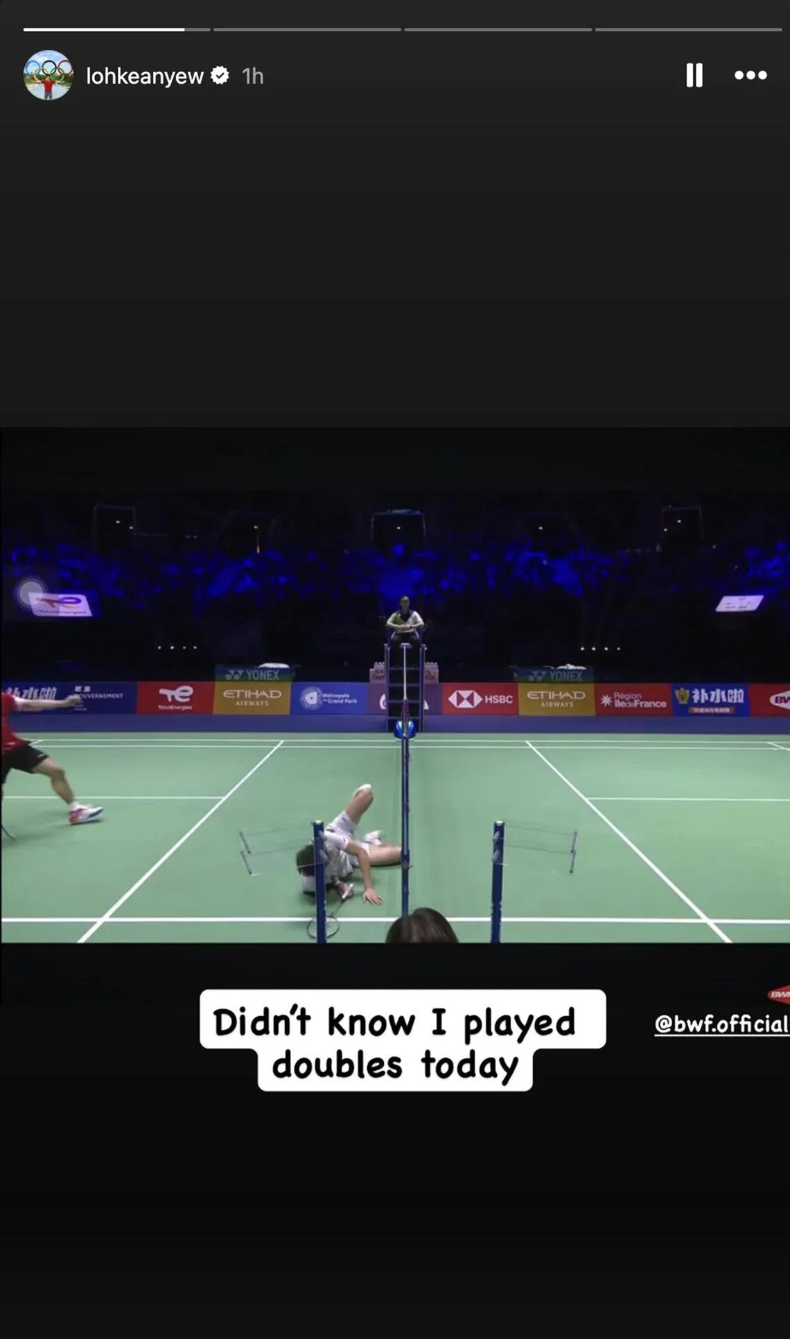 Loh Kean Yew (left) posted a video on Instagram showing Victor Lai (right) on the Singaporean’s side of the court during his 22-20, 21-18 quarter-final defeat at the BWF World Championships in Paris on Aug 29.