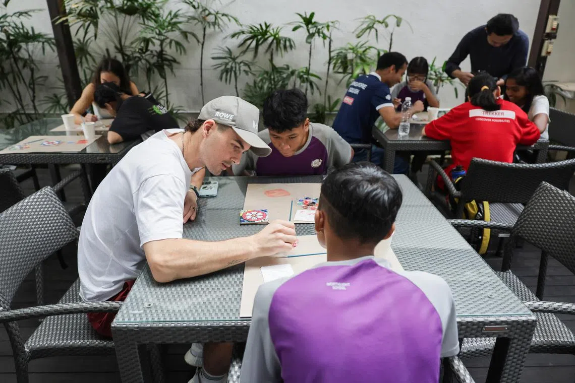 Paul Coll (left) at a Peranakan tile-painting activity with students from Northlight School after the press conference.
