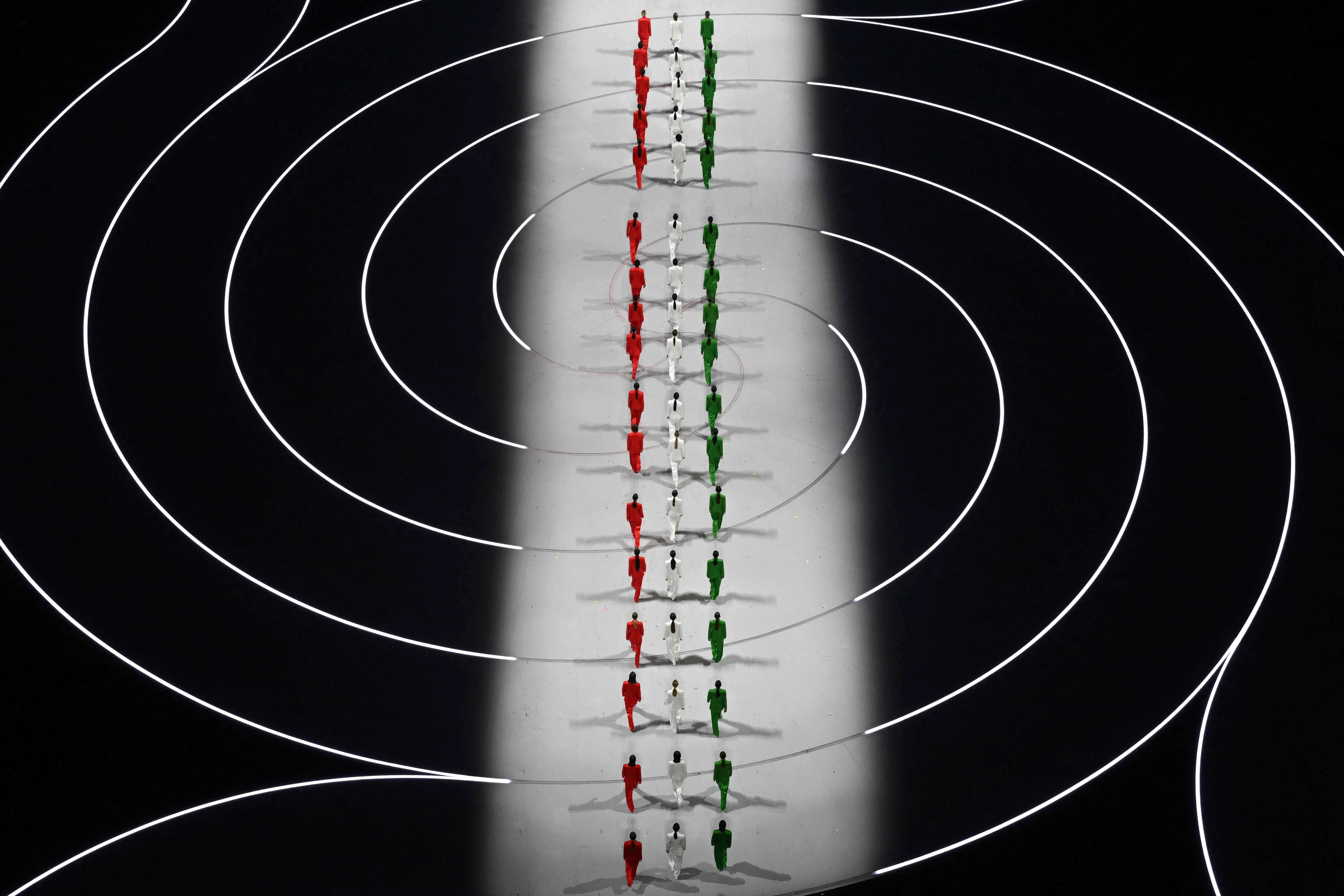 Models wearing creations designed by Giorgio Armani in the colours of the Italian flag walk during the opening ceremony in Milan.
