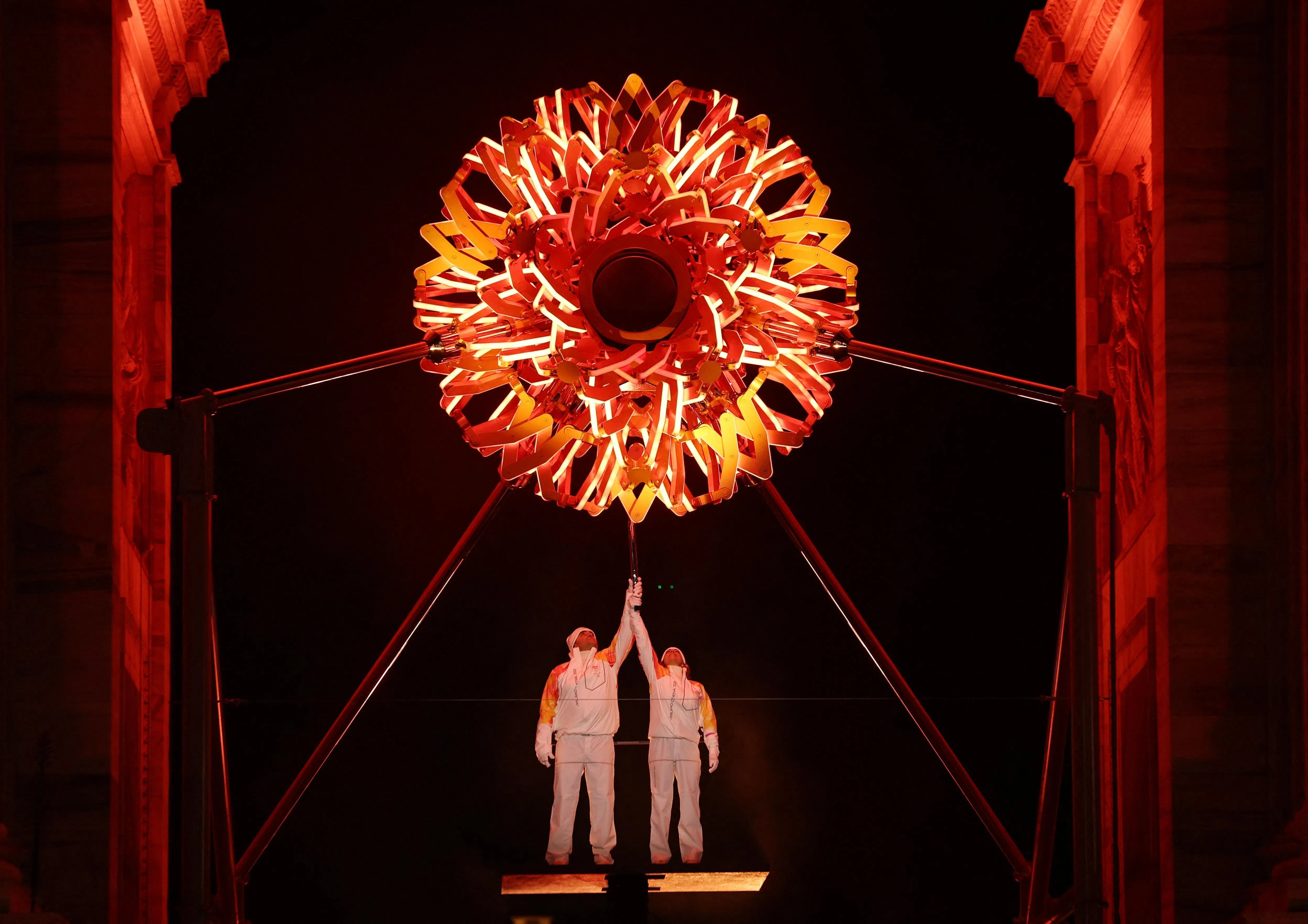 The Olympic cauldron under the Arco della Pace in Milan is lit by Alberto Tomba and Deborah Compagnoni.