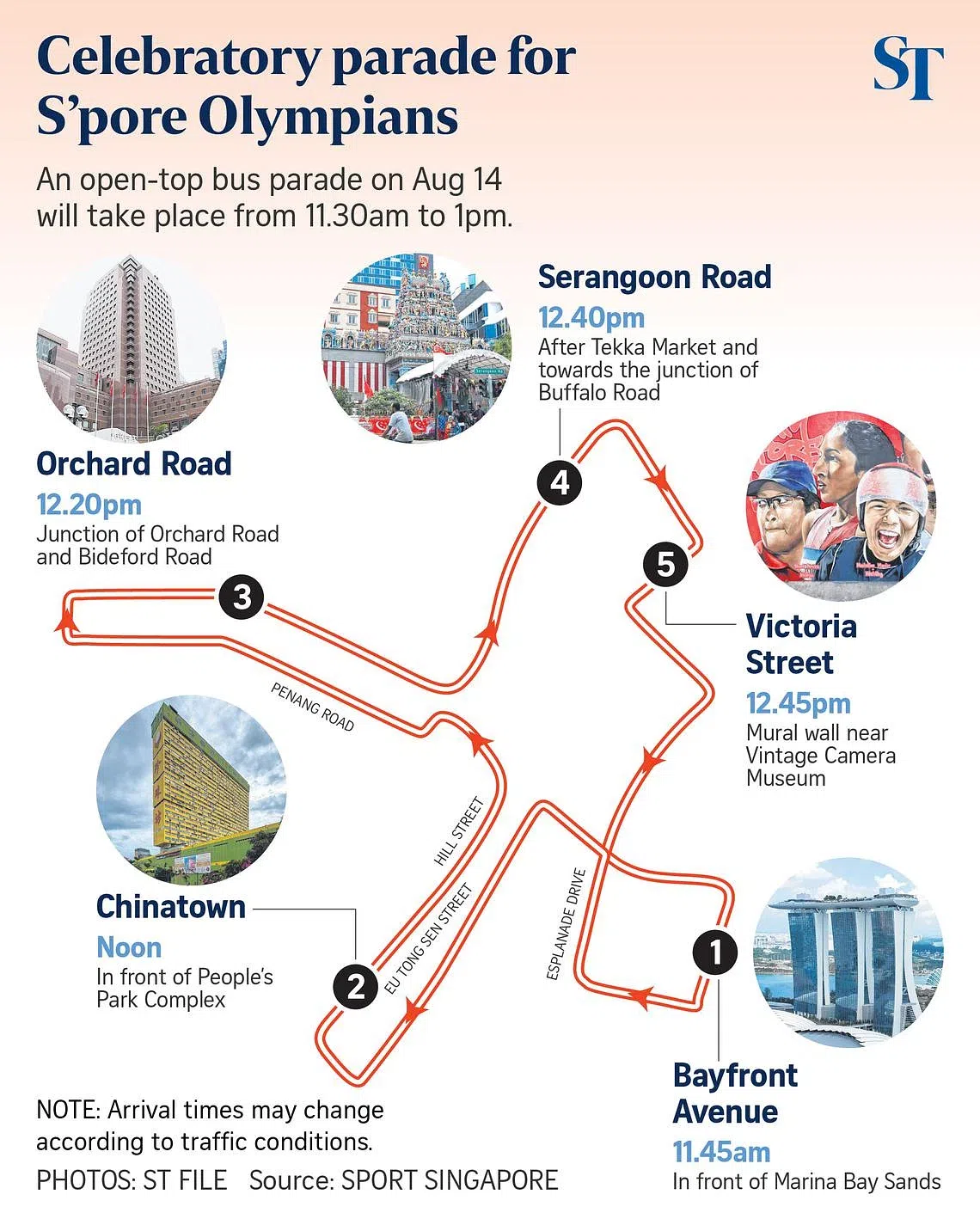 Maximilian is set for another grand reception on Aug 14 during an open-top bus celebratory parade which will feature him and nine other athletes from Singapore’s Paris 2024 Olympics contingent. The bus will travel through Bayfront Avenue, Chinatown, Orchard Road, Serangoon Road and Victoria Street from 11.30am to 1pm.
