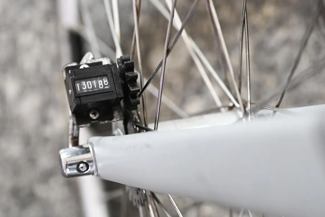 Then he gets on his bicycle and rides up and down the calibration course four times. A counter affixed on his bicycle records the number of revolutions the wheel (counters) makes across a certain distance.