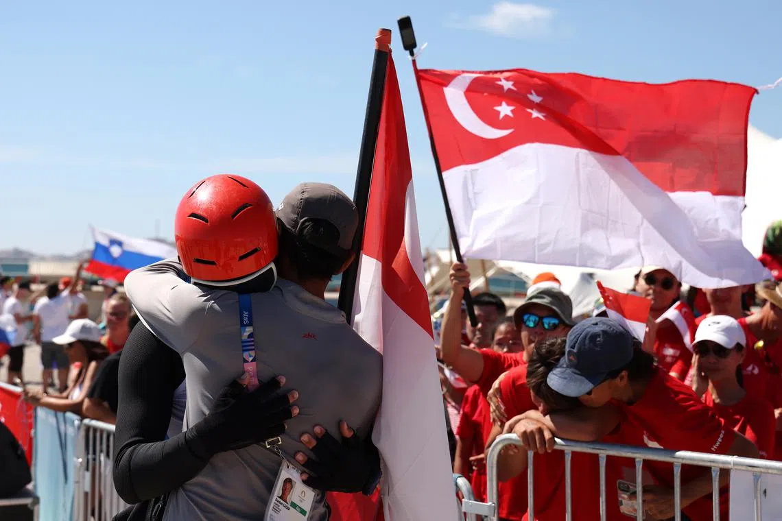 Maximilian (right) and his coach Johnny Dolenc after the final race at the Marseille Marina on Aug 9.