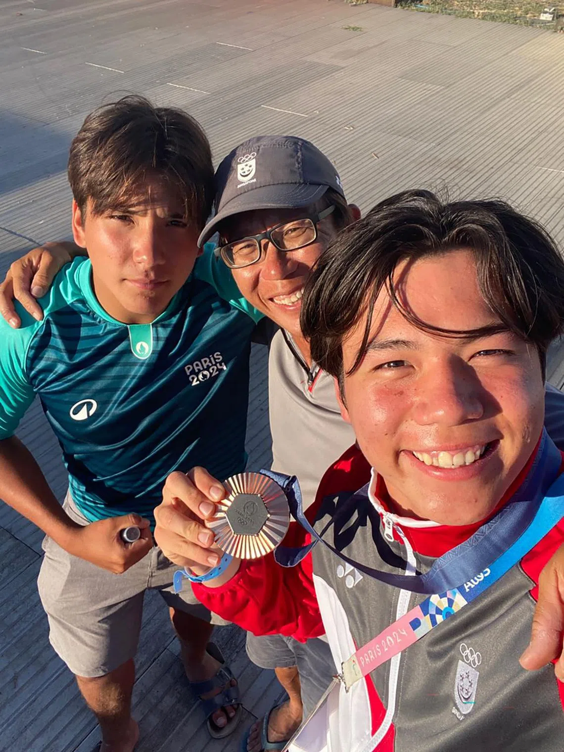 Maximilian (left) celebrating his bronze medal with Leow at the Paris Olympics.