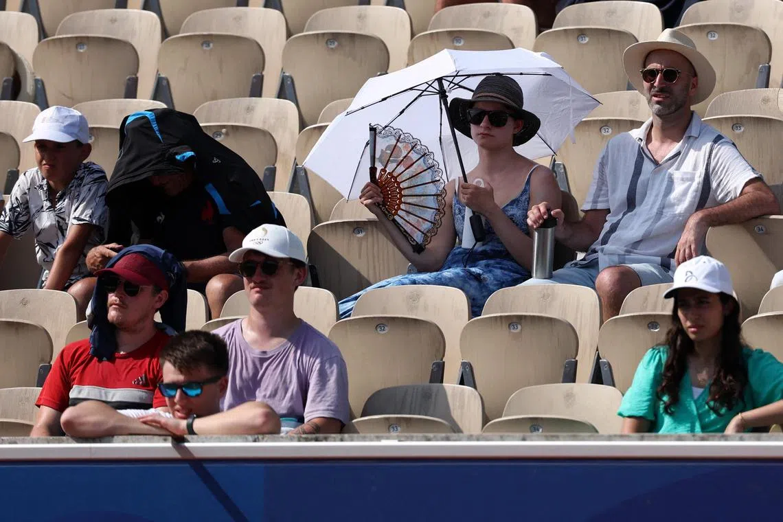 Spectators cool off in the hot weather before the start of the archery competition at the 2024 Paris Olympics.