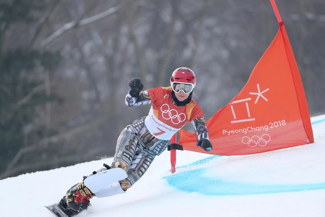 An athlete competing in the parallel giant slalom final at the 2018 Pyeongchang Winter Games.