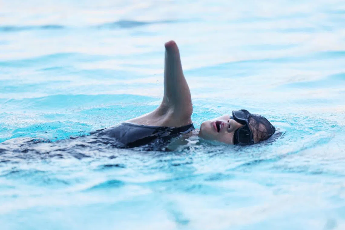 Moza Baihakki swimming laps as part of training at the APS Swim School.
