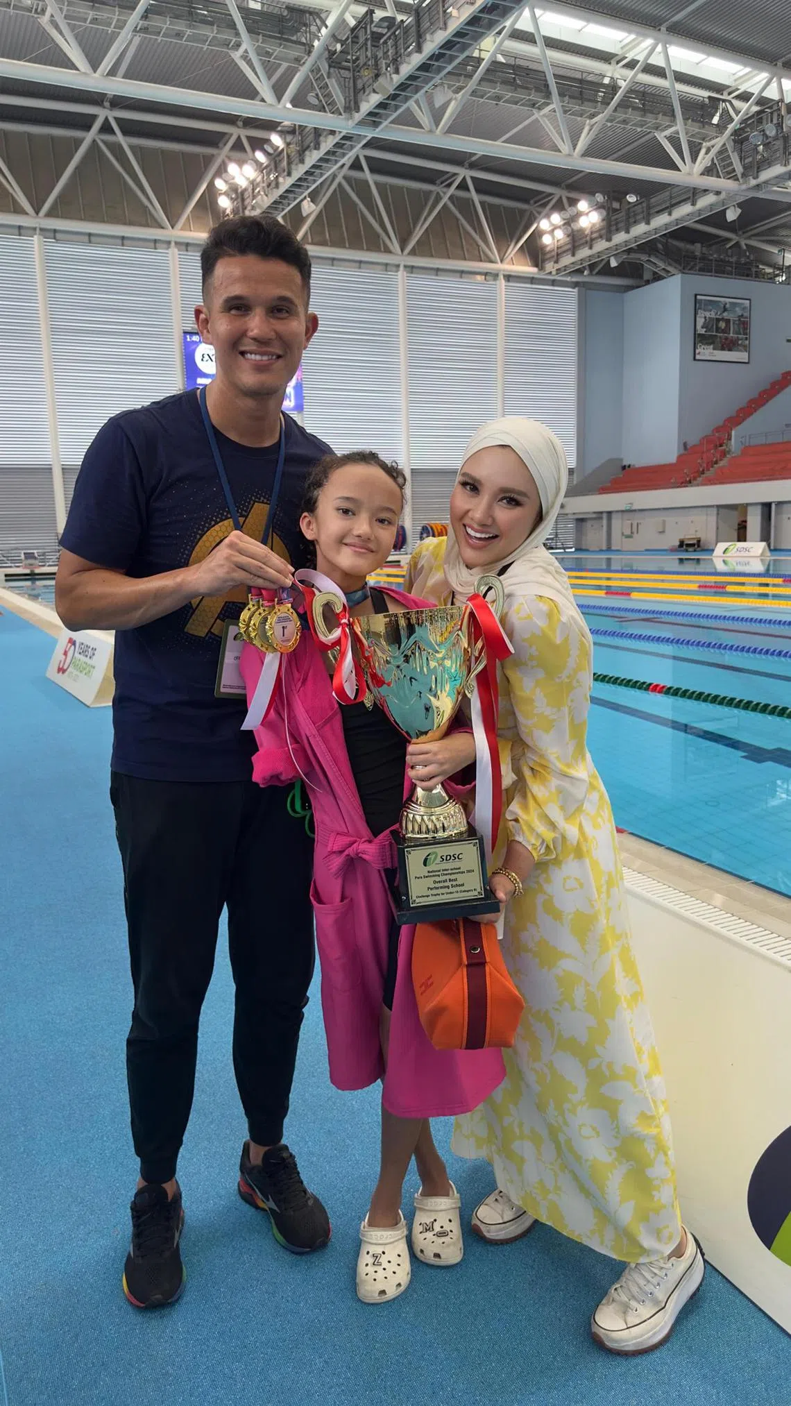 Moza Baihakki with parents Baihakki Khaizan and Norfasarie Mohd Yahya after her competitive swim debut on March 23.