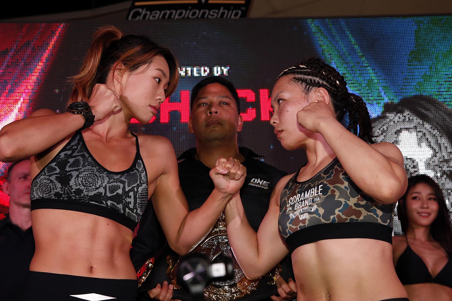 Angela Lee (left) and Mei Yamaguchi (right) at their atomweight title clash on May 5, 2016.
