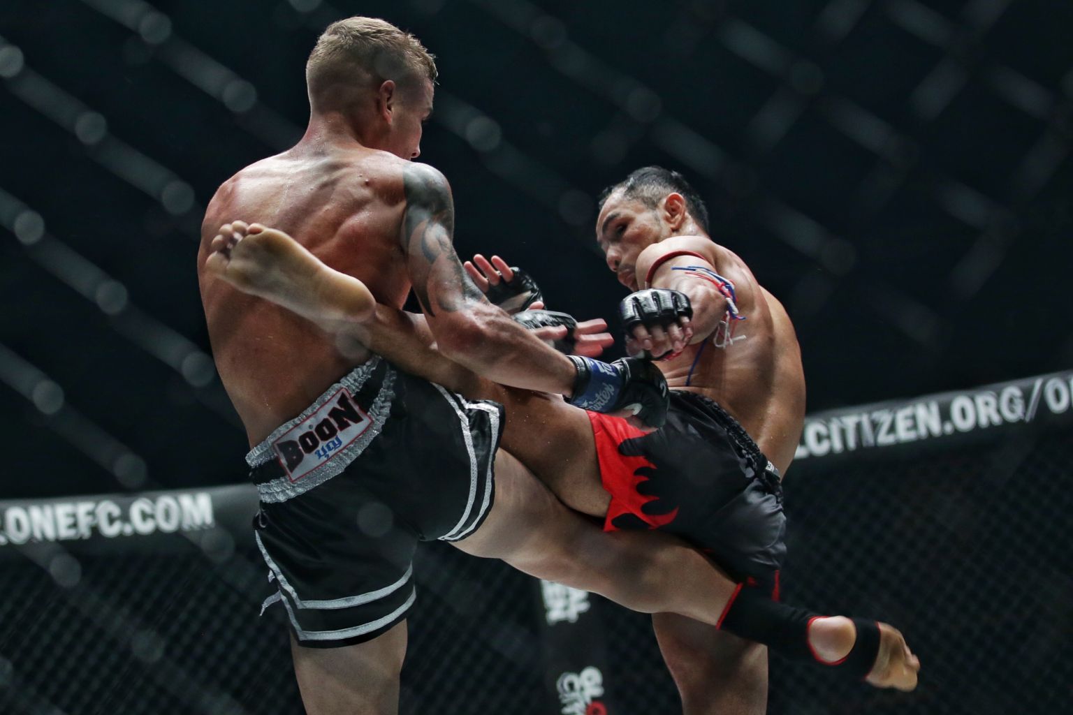 A photo taken on Feb 28, 2020, shows Australia's Rocky Ogden and Thailand's Sam-A Gaiyanghadao during their Strawweight Muay Thai World Championship bout in One Championship's King of the Jungle event at the Singapore Indoor Stadium.