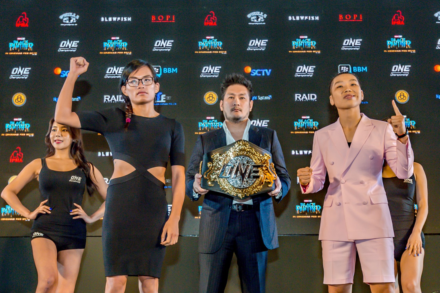 Singapore's Tiffany Teo (second left) and China's Xiong Jingnan (right) at the One Championship Kings of Courage press conference at the Fairmont Jakarta.