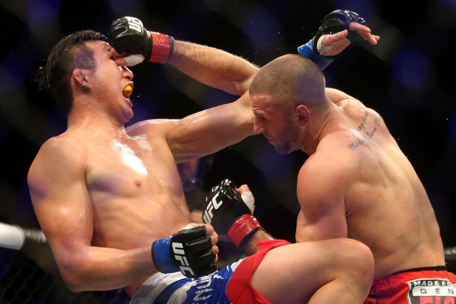 File photo of Belgium's Tarec Saffiedine (right) against Korea’s Lim Hyun Gyu in the first Ultimate Fighting Championship show in Singapore at the Marina Bay Sands on Jan 4, 2014.