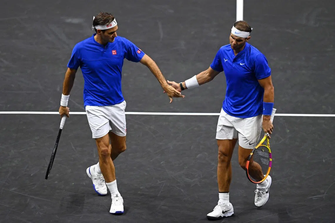 Switzerland’s Roger Federer (left) and Spain’s Rafael Nadal (right) during the 2022 Laver Cup men’s doubles tennis match on Sept 23, 2022.