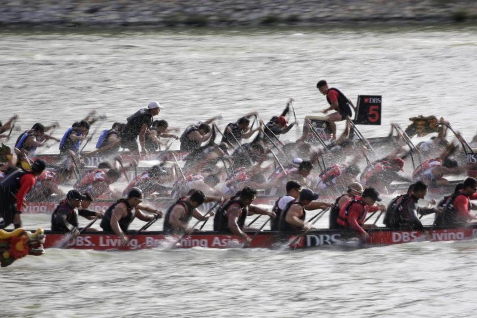 Participants racing to the finish line during the Singapore National Premier Open final of the Singapore Dragon Boat Festival held at the Marina Channel on July 16, 2017.