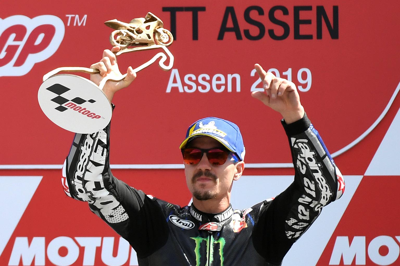 Monster Energy Yamaha's Maverick Vinales celebrating on the podium after winning the Dutch MotoGP in Assen on June 30, 2019.