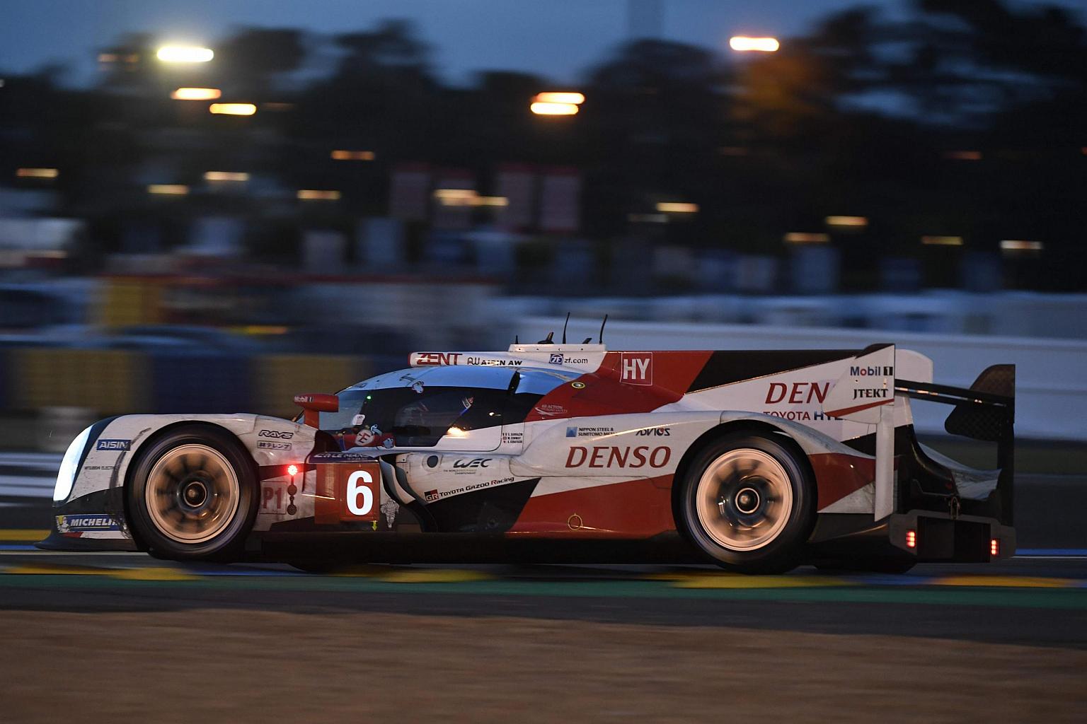 LE MANS (AFP) - The Toyota TS050 Hybrid of Stephane Sarrazin led the Le Mans 24 Hour Race heading into the night on Saturday, battling back the early challenge of Porsche on a rain-soaked day.