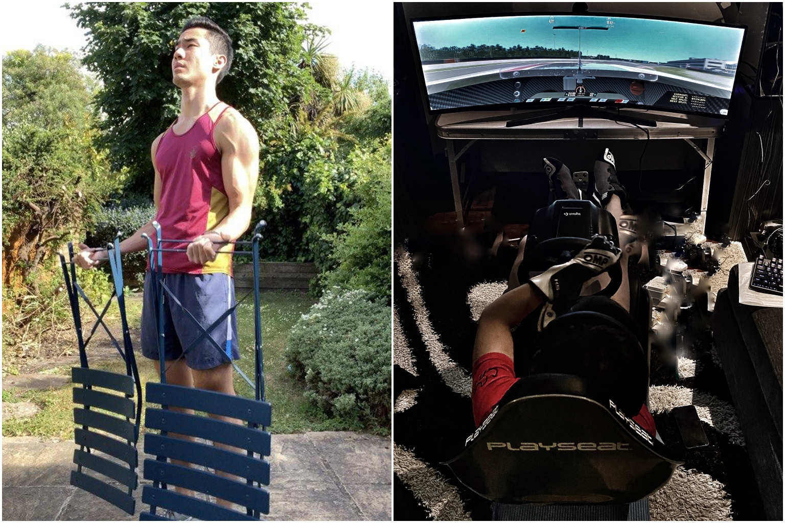 Sean Hudspeth (left) has been using garden tables and chairs as weights and Christian Ho has been staying sharp by racing on a simulator.