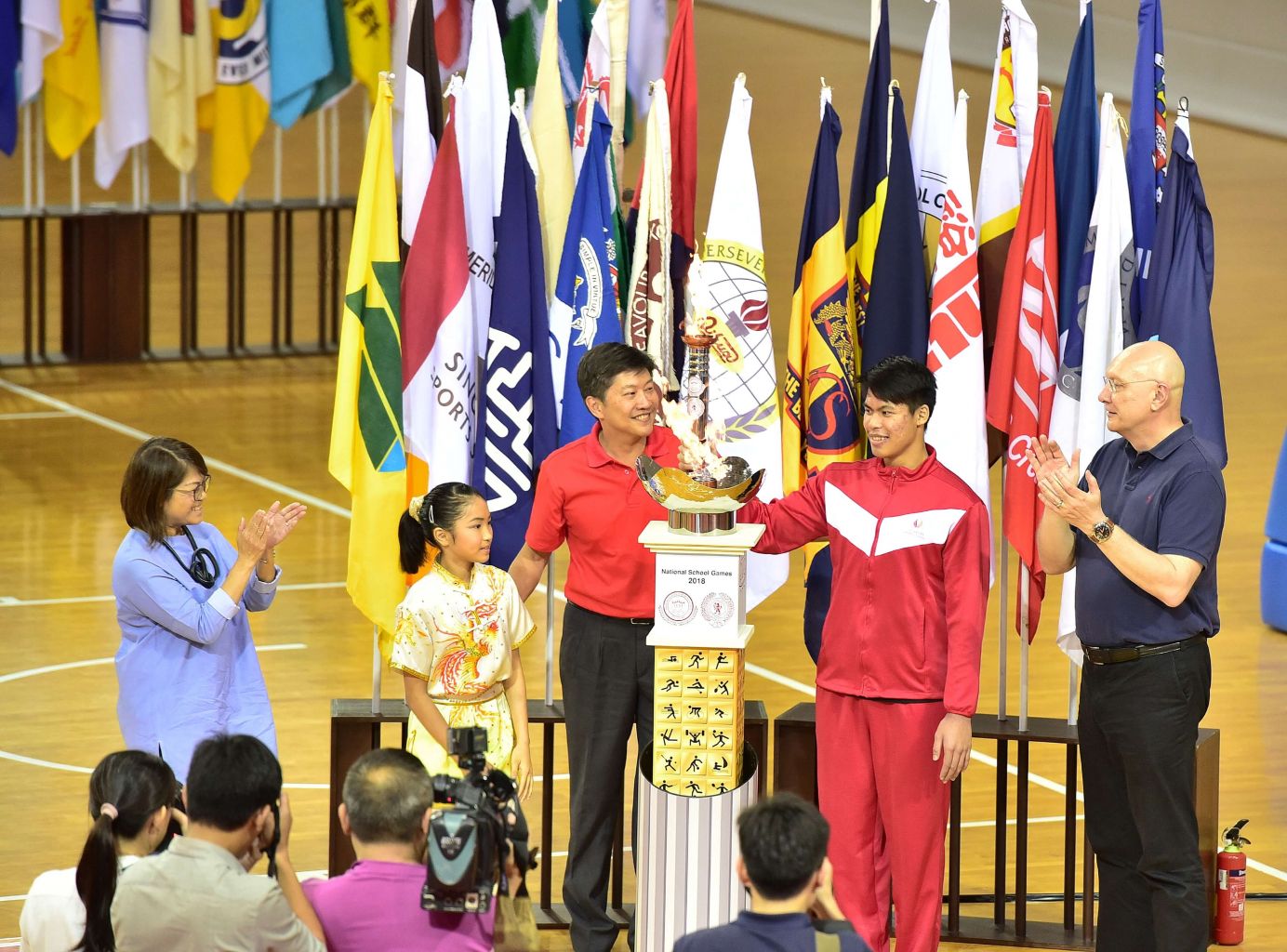 (From left Lee Hui Feng, chairman, Singapore Primary Schools Sports Council and principal of Qihua Primary; Cassandra Ong, 11, of Tao Nan School; Minister Ng; Lincoln Forest Liqht Man, 18, of Sports School and ACS (I) principal Winston Hodge.