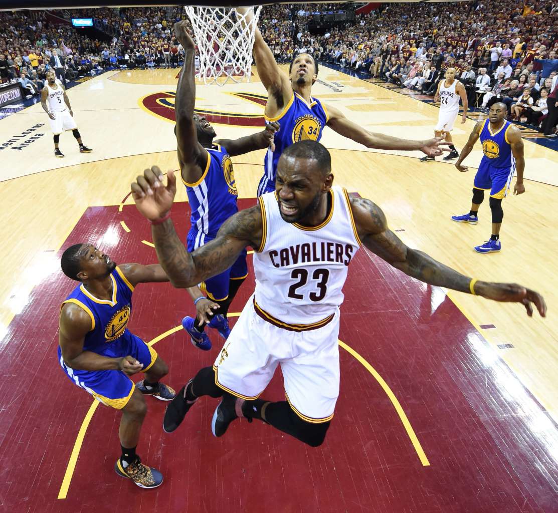 Cleveland Cavaliers' LeBron James is fouled while going to the basket against the Golden State Warriors in the NBA finals Game 4, on June 10, 2016.