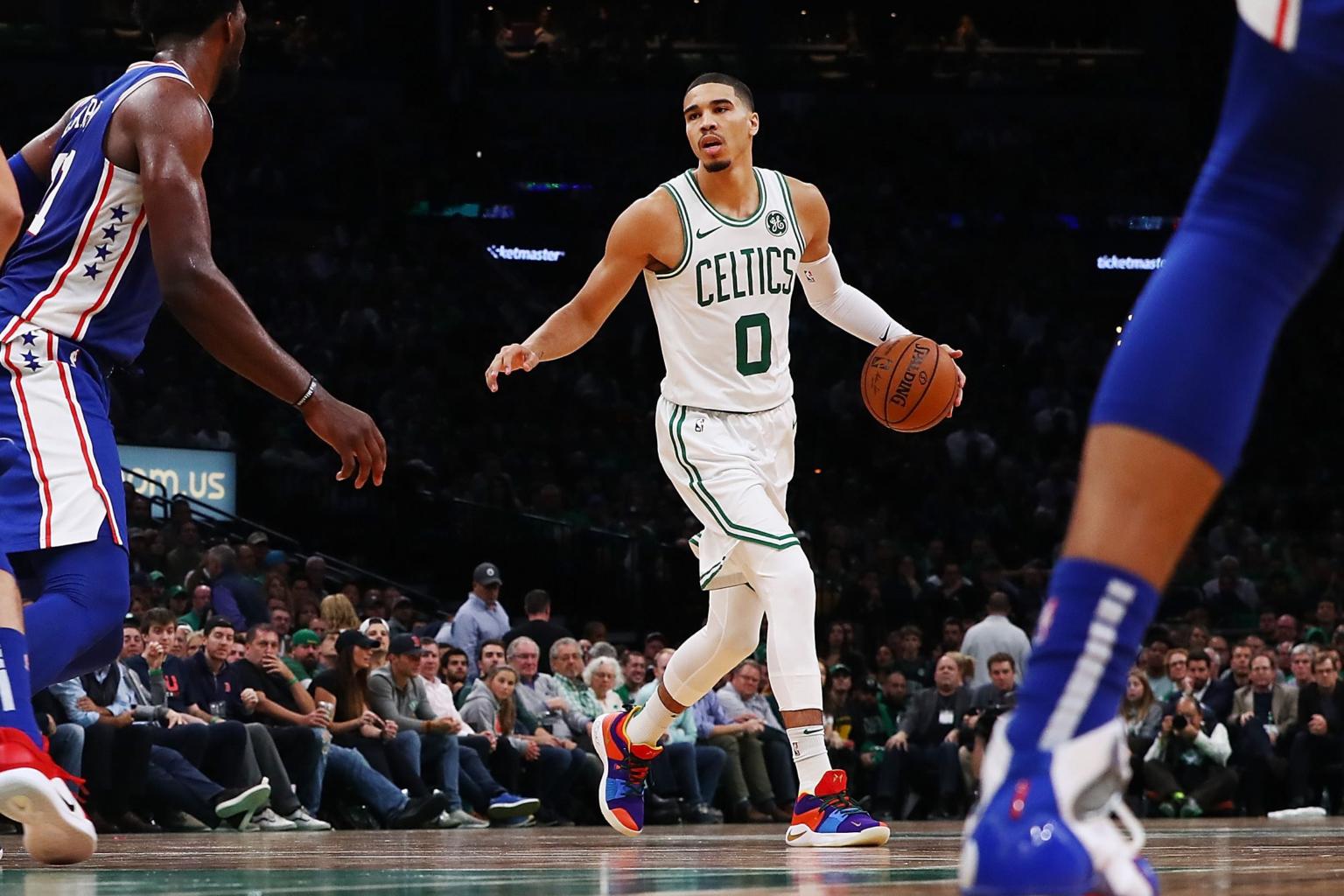 Jayson Tatum of the Boston Celtics dribbles the ball during the game against the Philadelphia 76ers at TD Garden, on Oct 16, 2018, in Boston, Massachusetts.