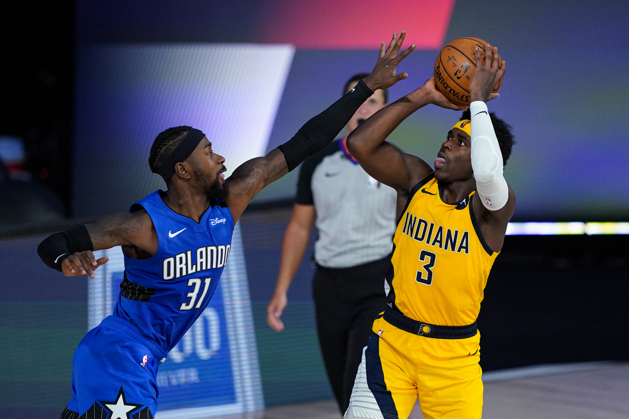 Indiana Pacers guard Aaron Holiday shoots over Orlando Magic guard Terrence Ross, on Aug 4, 2020.