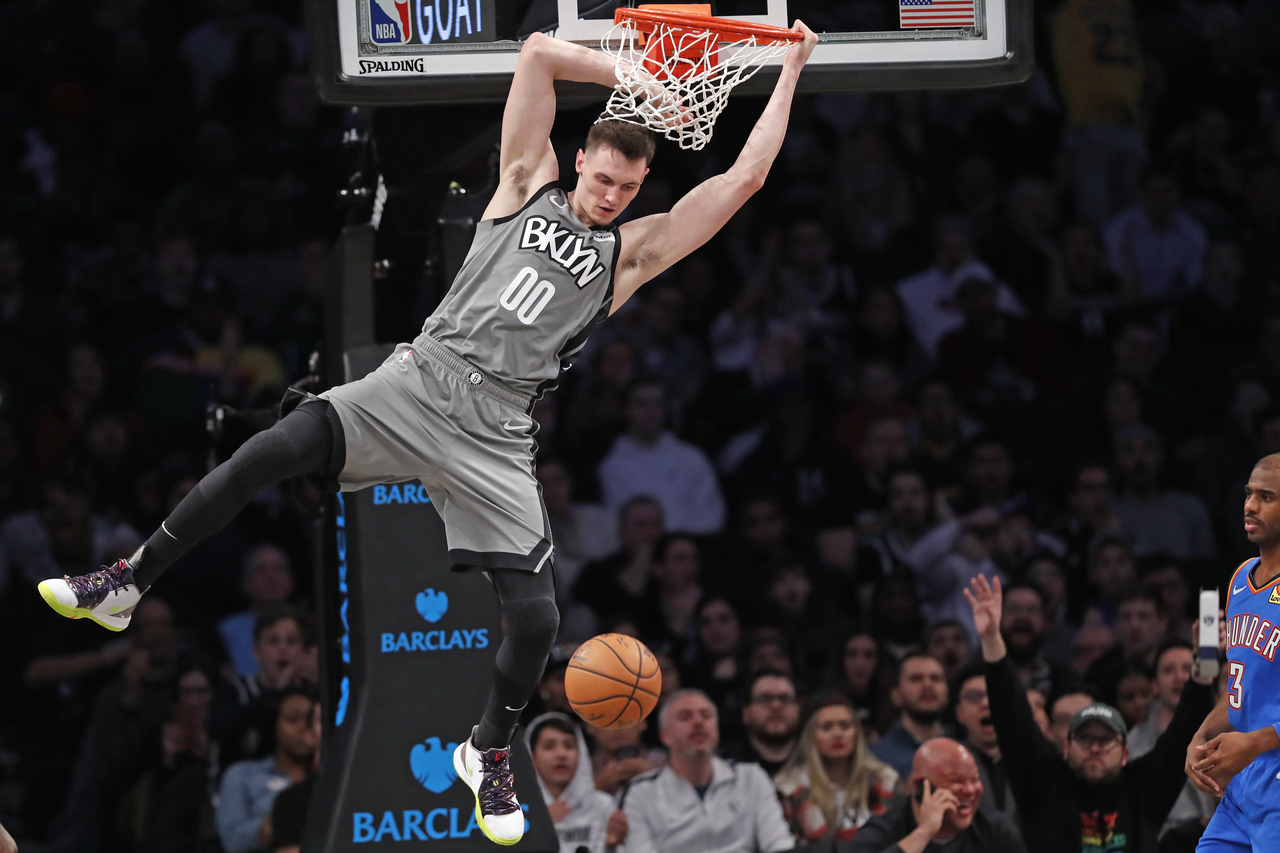 Brooklyn Nets forward Rodions Kurucs hangs from the rim after dunking a ball during an NBA basketball game against the Oklahoma City Thunder on Jan 7, 2020, in New York.