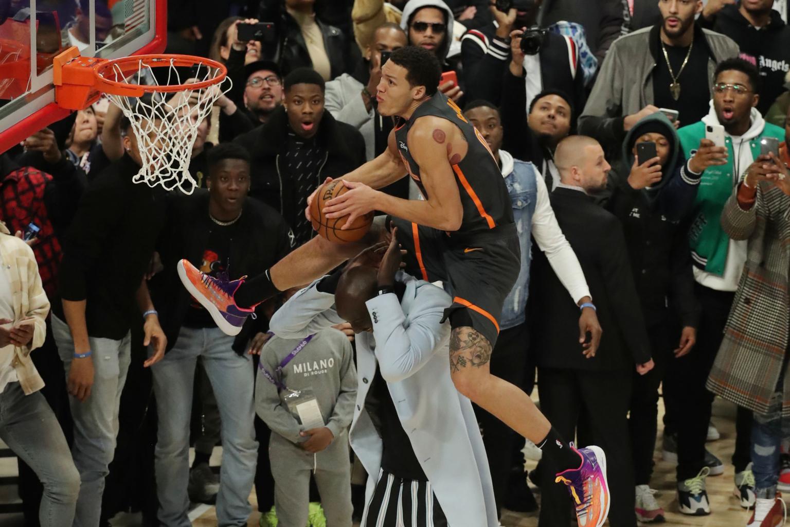 Orlando Magic's Aaron Gordon dunks over Tacko Fall in a slam dunk contest during NBA All Star Saturday Night on Feb 15, 2020.
