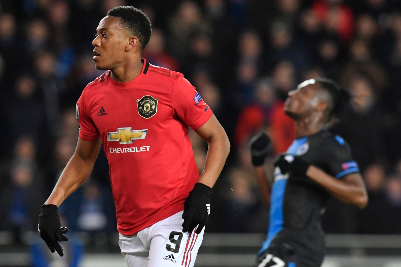 Manchester United's Anthony Martial celebrates scoring a goal during a match at the Jan Breydel Stadium in Bruges on Feb 20, 2020.