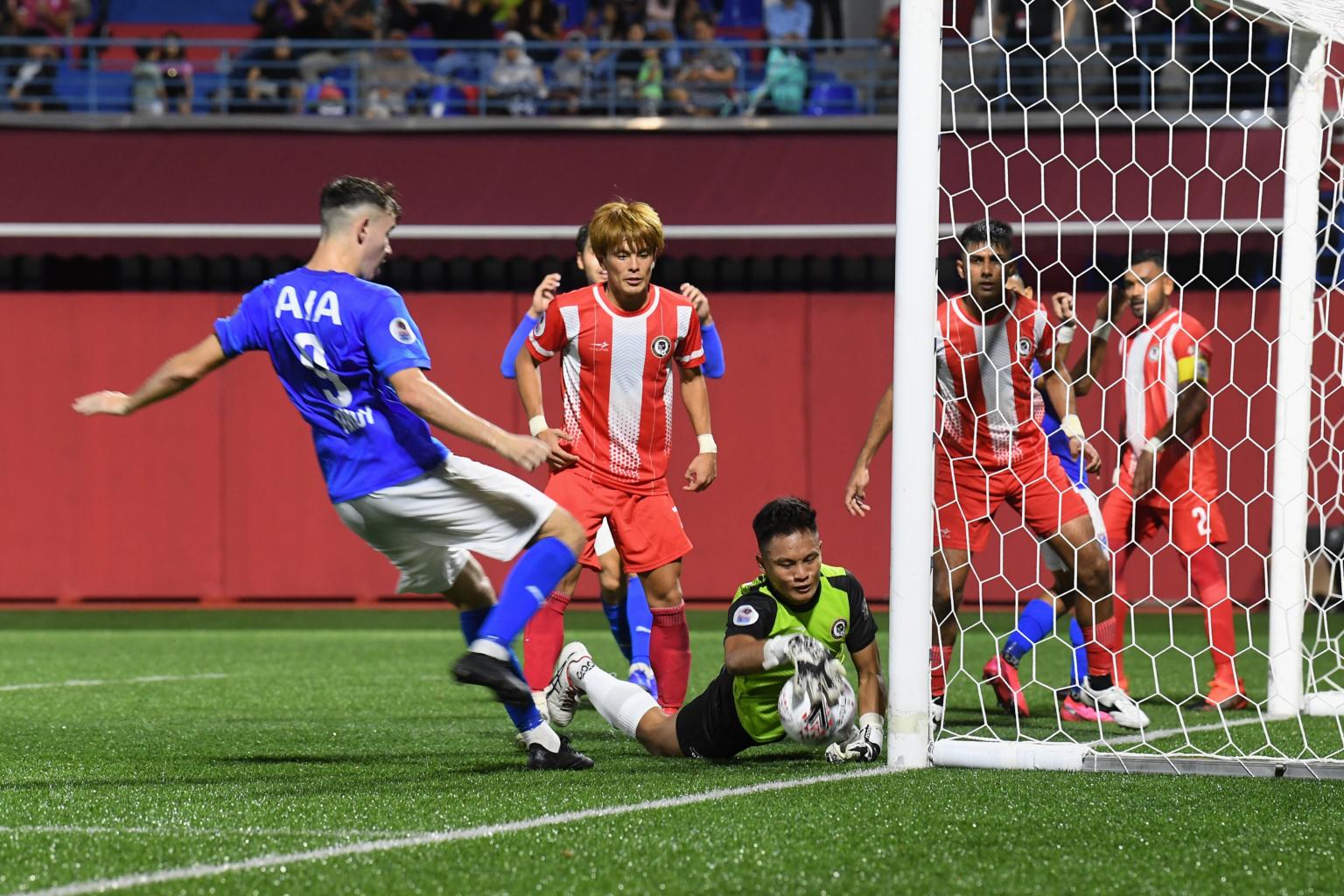 Tanjong Pagar United goalkeeper Kenji Rusydi saves the ball from Lion City Sailors players.