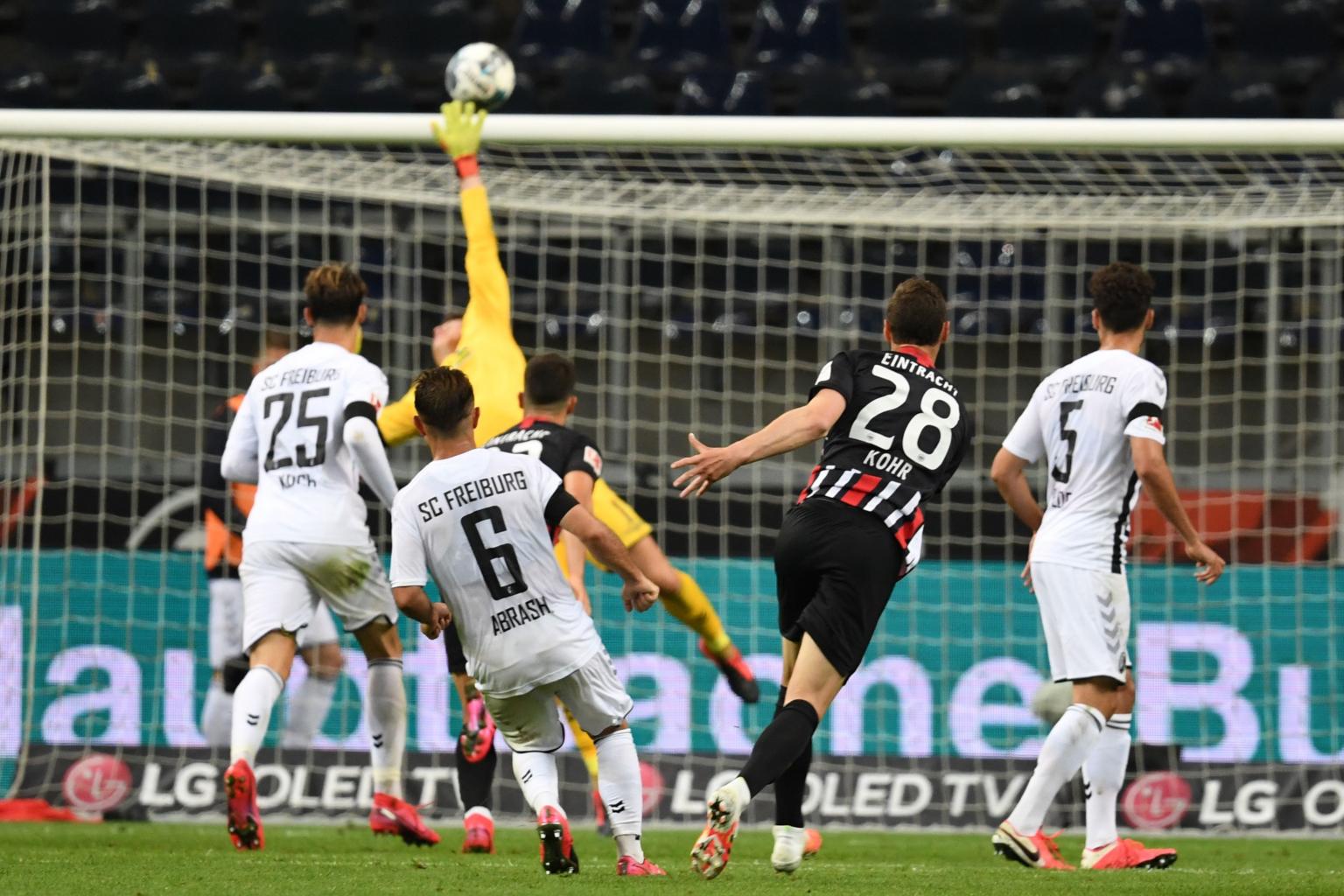 Freiburg's German goalkeeper Alexander Schwolow (background, centre) fends off a ball shot by Frankfurt's German midfielder Dominik Kohr (second, right), on May 26, 2020.