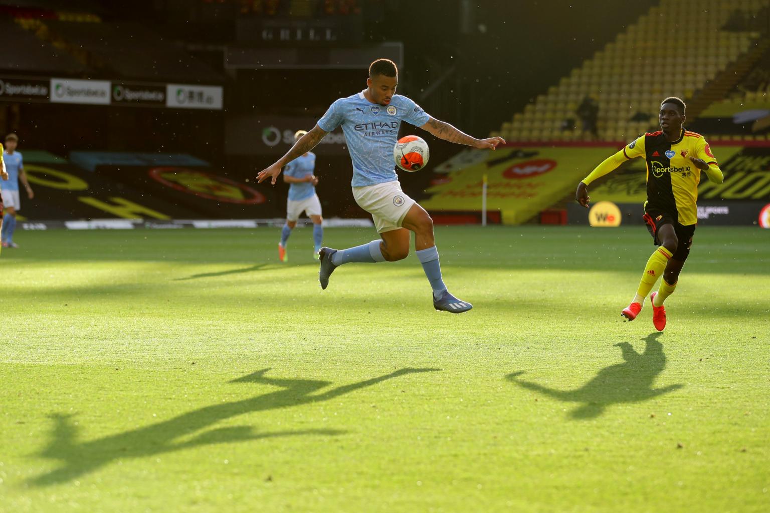 Manchester City's Gabriel Jesus in action with Watford's Ismaila Sarr.