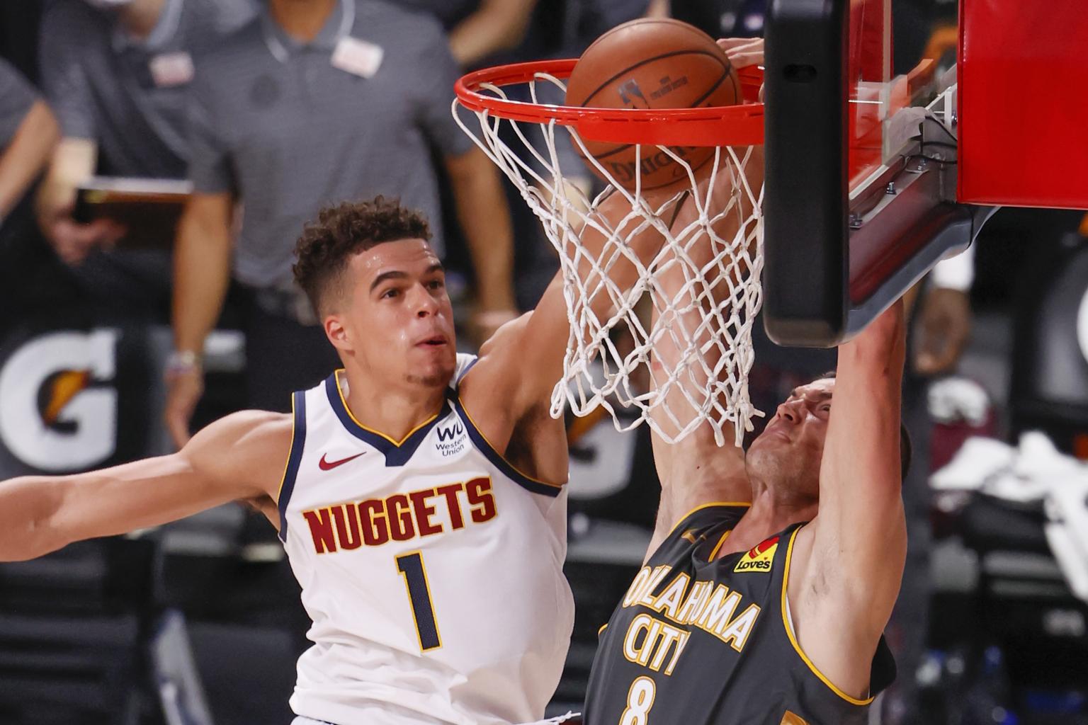 Denver Nuggets forward Michael Porter Jr. (left) fails to block the shot of Oklahoma City Thunder forward Danilo Gallinari in a game at the ESPN Wide World of Sports Complex in Florida on Aug 3, 2020.