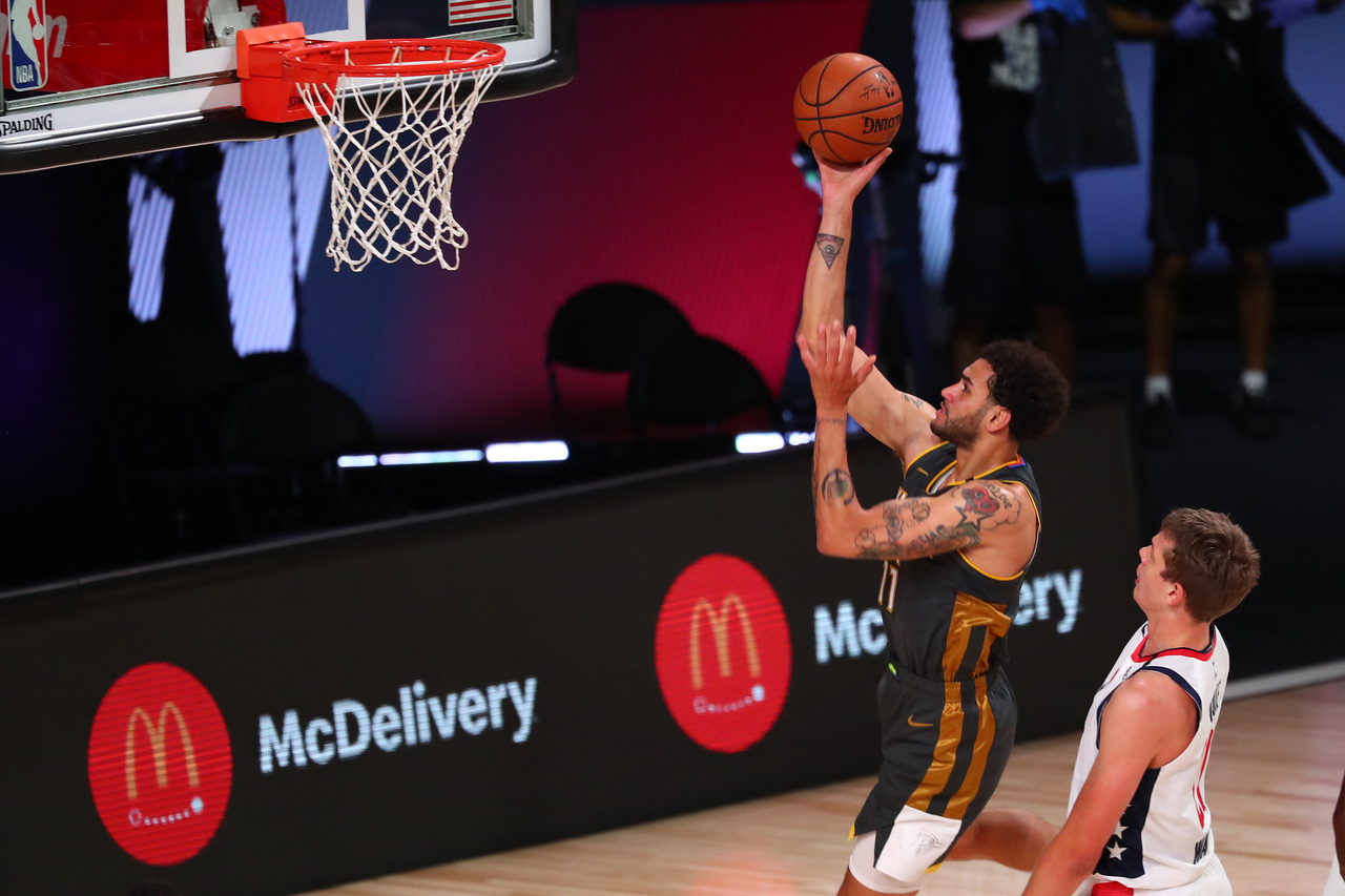 Oklahoma City Thunder forward Abdel Nader shoots over Washington Wizards forward Moritz Wagner at AdventHealth Arena.