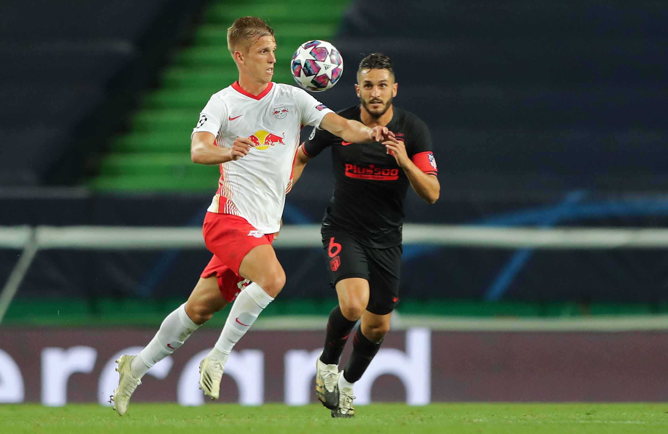 Leipzig's Spanish midfielder Dani Olmo vies with Atletico Madrid's Spanish midfielder Koke during the Uefa Champions League quarter-final.