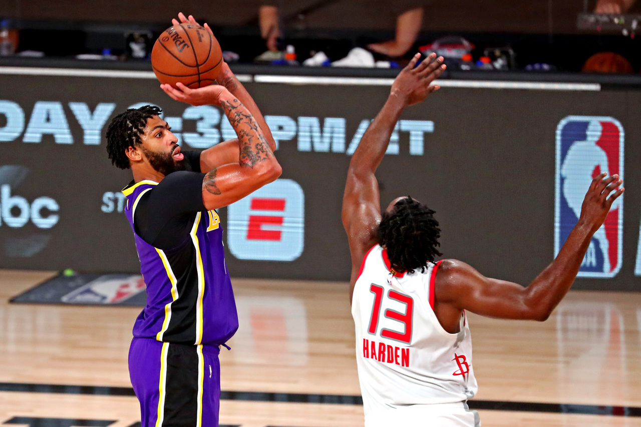 Los Angeles Lakers forward Anthony Davis shoots the ball against Houston Rockets guard James Harden during the fourth quarter at 2020 NBA Playoffs.