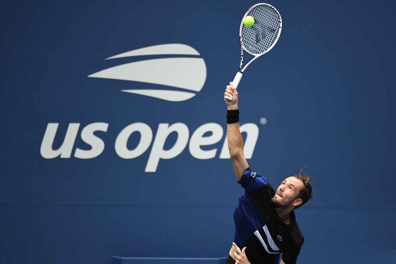 Daniil Medvedev serves against Andrey Rublev in the men's singles quarter-finals match on day nine of the 2020 US Open tennis tournament.