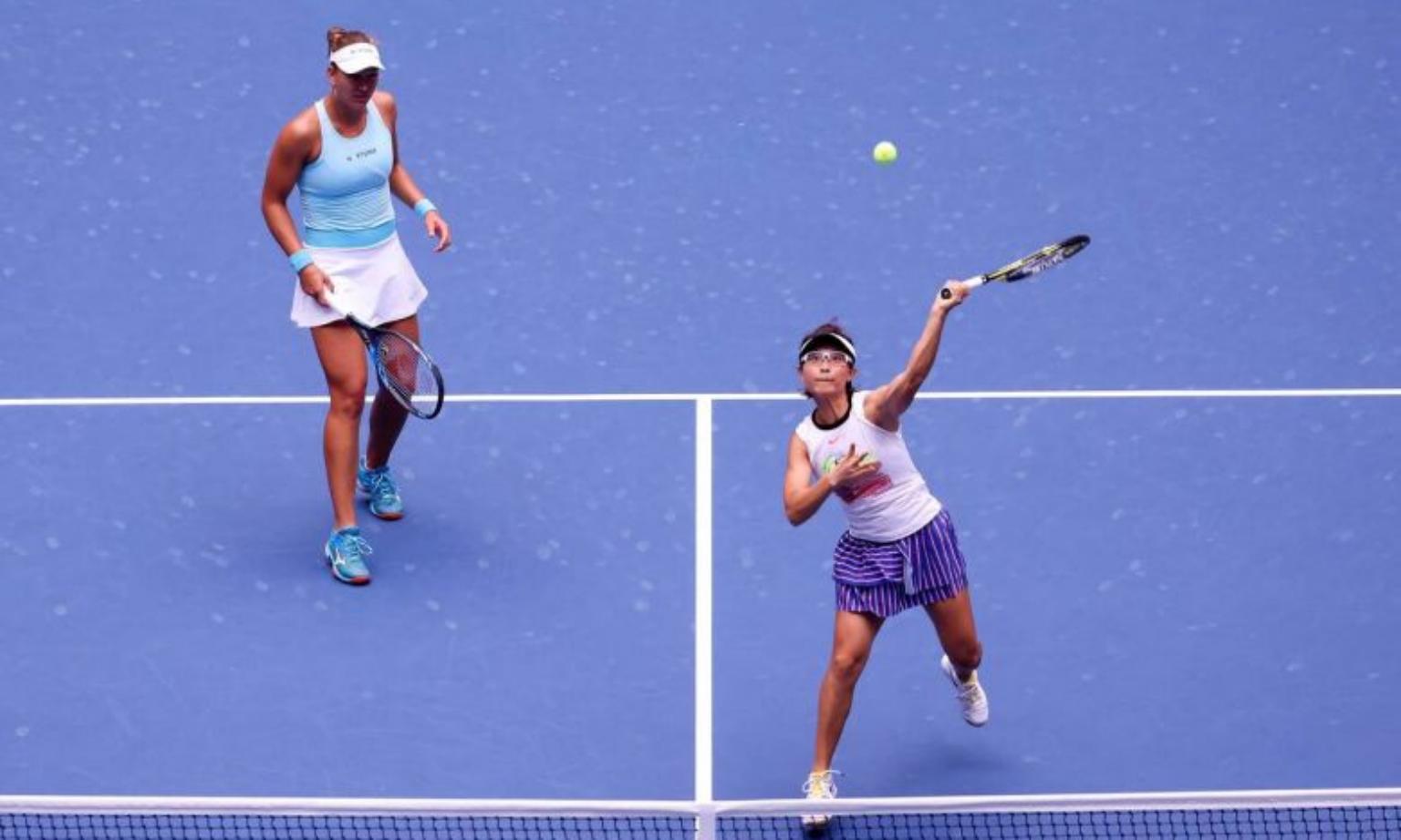 Nicole Melichar (left) of the United States and Yifan Xu of China return the ball during their Women's Doubles final match the 2020 US Open, on Sept 11, 2020.
