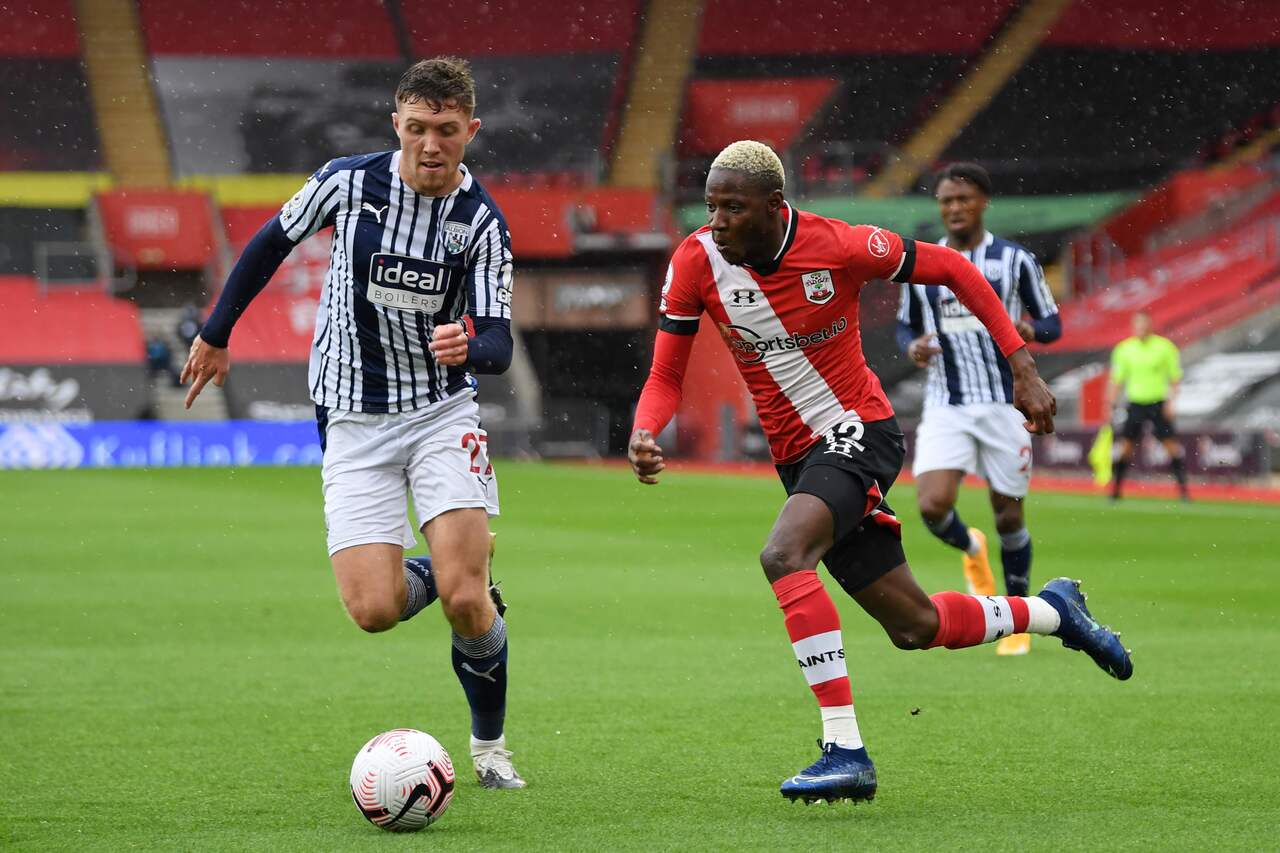 Southampton's Malian midfielder Moussa Djenepo runs with the ball as West Bromwich Albion's Irish defender Dara O'Shea chases back during the EPL football match on Oct 4.
