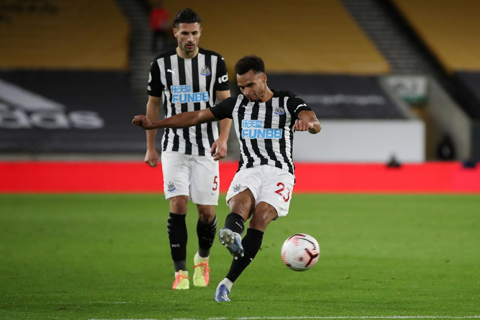 Newcastle United's English midfielder Jacob Murphy scores the equalising goal during the English Premier League football match between Wolverhampton Wanderers and Newcastle United on Oct 25, 2020.