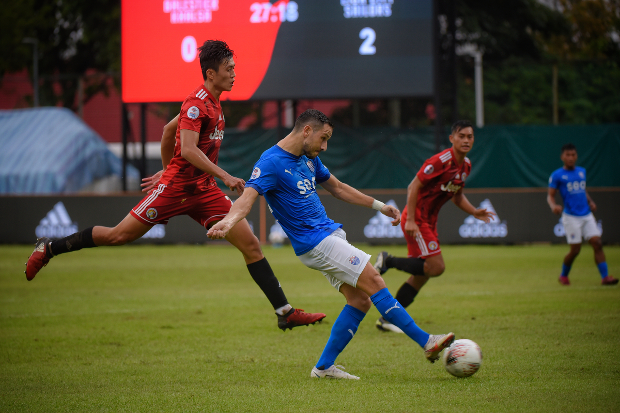 Stipe Plazibat (centre) of Lion City Sailors scores the third goal against Balestier Khalsa during the Singapore Premier League match held at Bishan Stadium, on Nov 7, 2020.