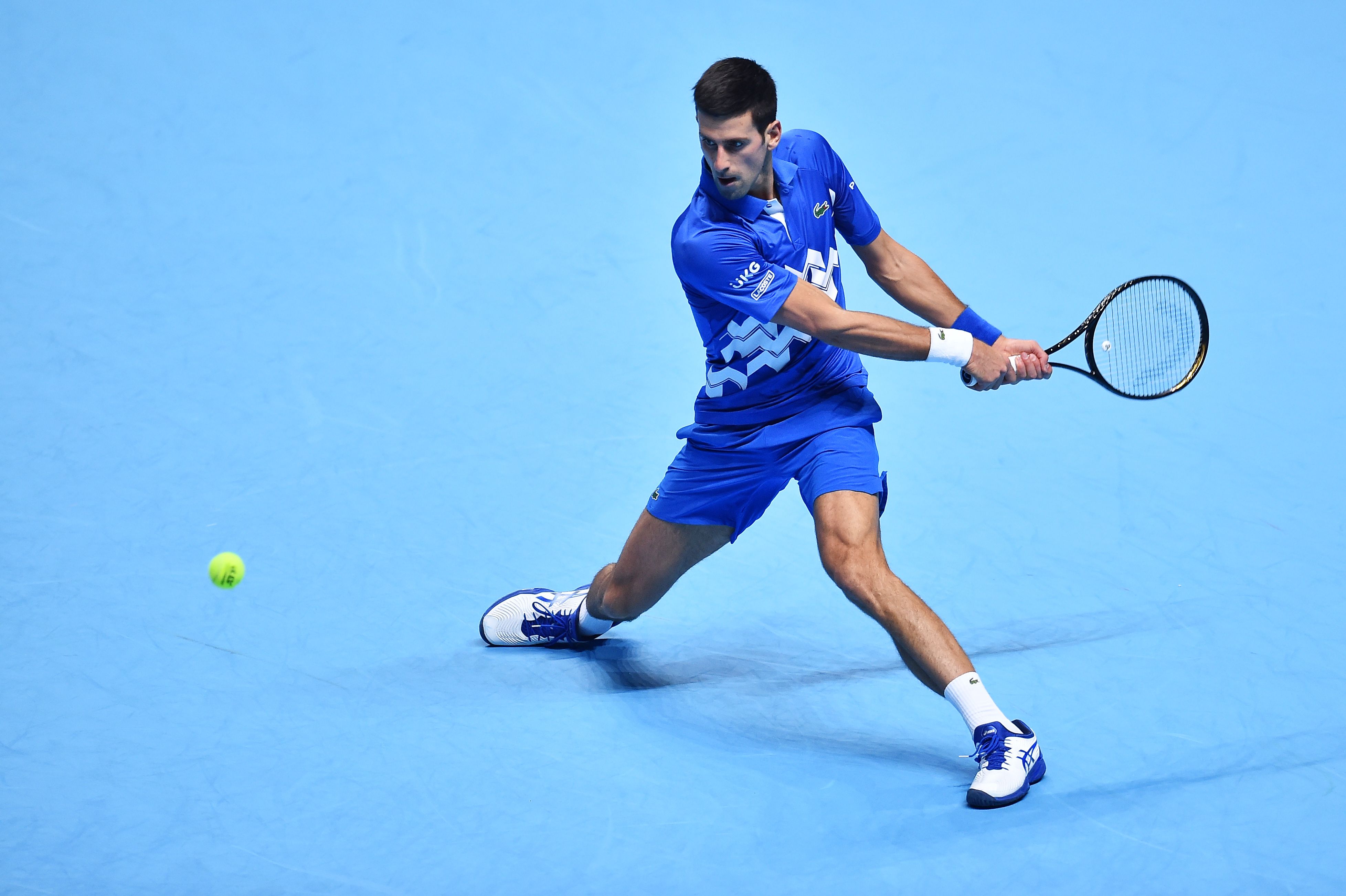 Serbia's Novak Djokovic returns to Russia's Daniil Medvedev during their men's singles of the ATP World Tour Finals at the O2 Arena in London on Nov 18, 2020.