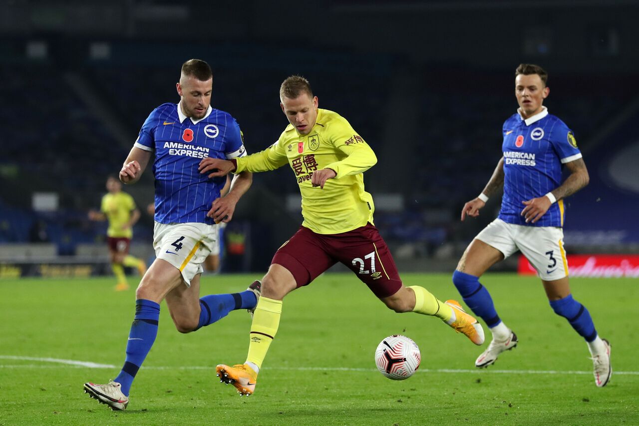 Burnley's Czech striker Matej Vydra (centre) runs at goal during the EPL football match against Brighton and Hove Albion on Nov 6, 2020.
