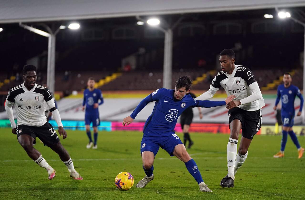 Chelsea's Mason Mount (centre) is challenged by Fulham's Tosin Adarabioyo during a match at Craven Cottage in London on Jan 16, 2021.