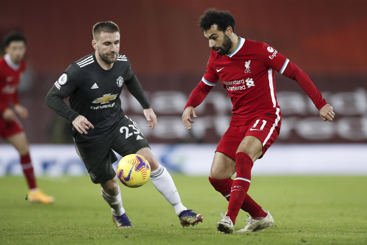 Mohamed Salah (right) of Liverpool in action against Luke Shaw of Manchester United during a match at Anfield, on Jan 18, 2021.