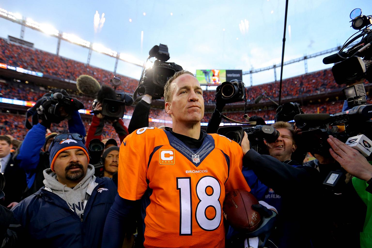 Peyton Manning #18 of the Denver Broncos walks off the field after defeating the New England Patriots in the AFC Championship game.