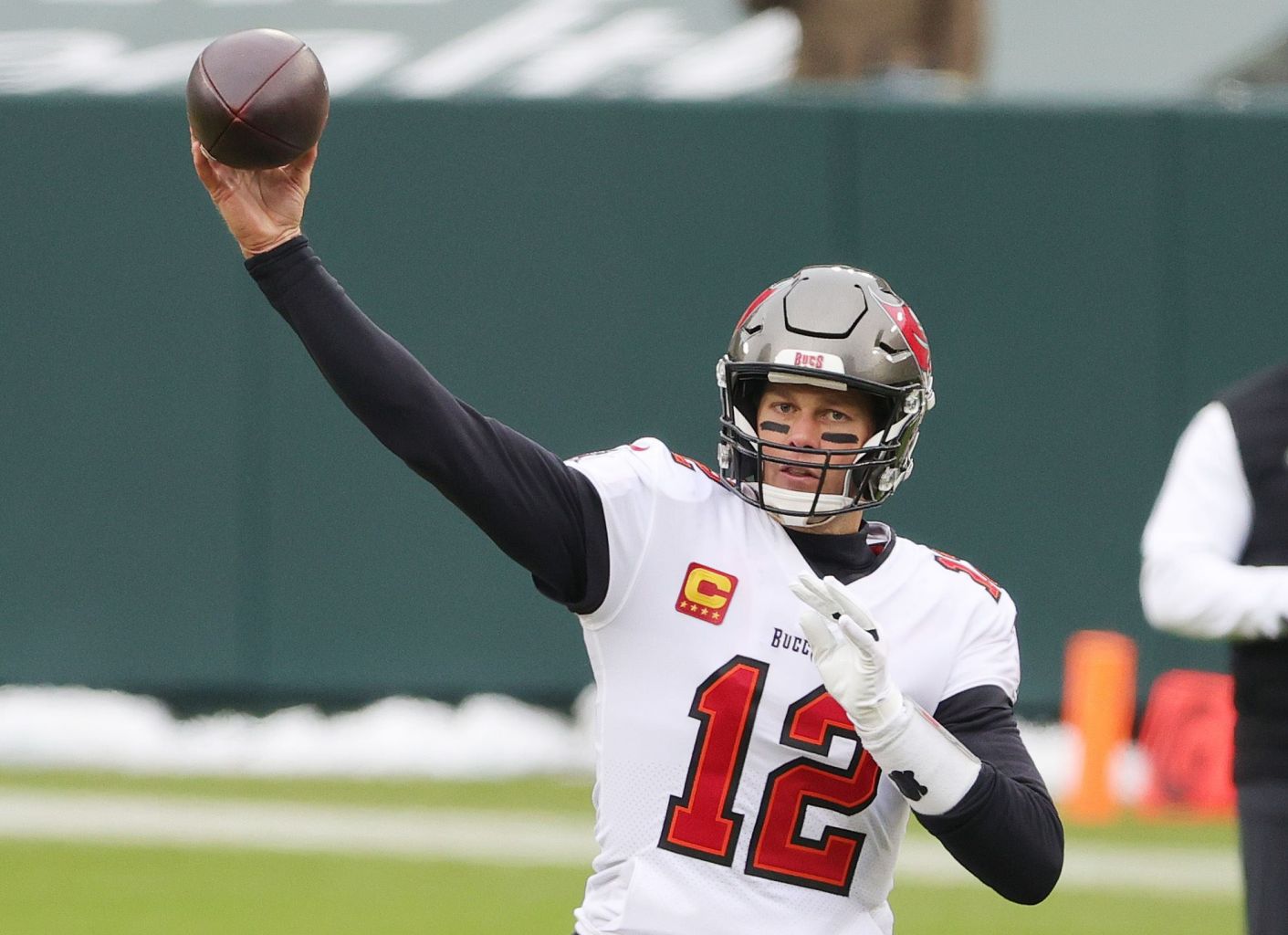 Tom Brady of the Tampa Bay Buccaneers warms up prior to their NFC Championship game against the Green Bay Packers on Jan 24, 2021.